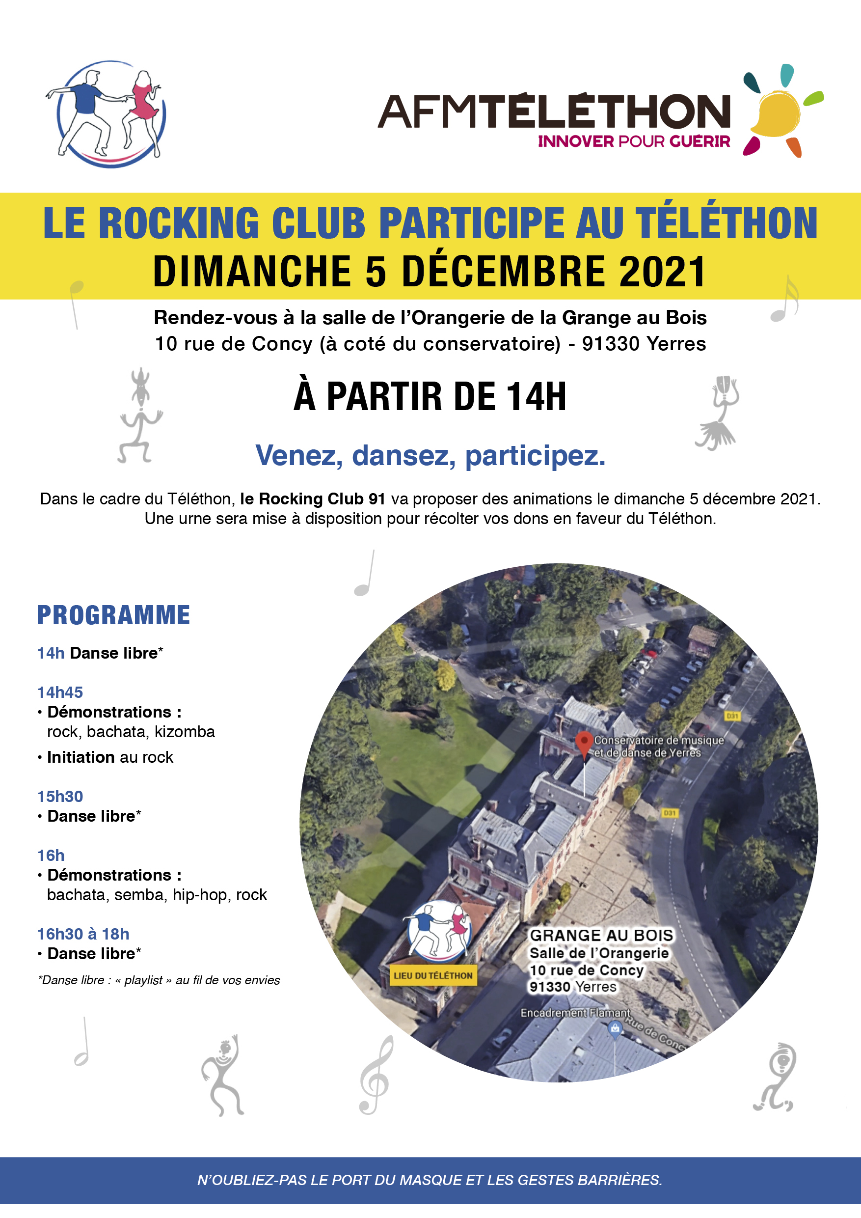 Dans le cadre du Téléthon, le Rocking Club 91 va proposer des animations le dimanche 5 décembre 2021 à la salle de l’Orangerie de la Grange au bois de Yerres (10 rue de Concy – à côté du conservatoire).