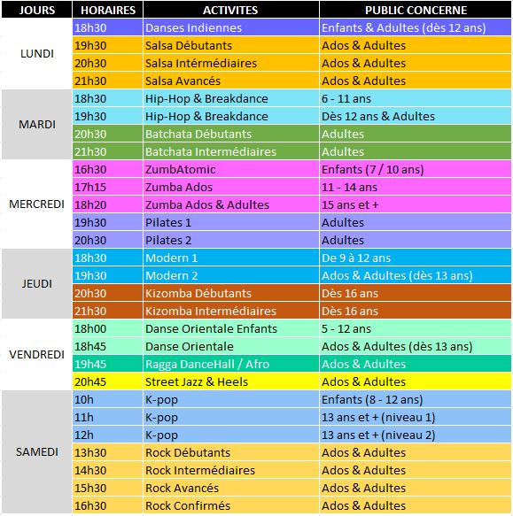 *hormis zumbatomic et danse orientale enfants qui durent 45 minutes chacune.